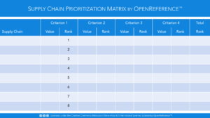 Supply Chain Prioritization Matrix: A tool to order supply chains according to relevance, and to facilitate the selection of key supply chains for consideration in later management phases. The matrix typically has more than one criterion for ranking. Example criteria are: